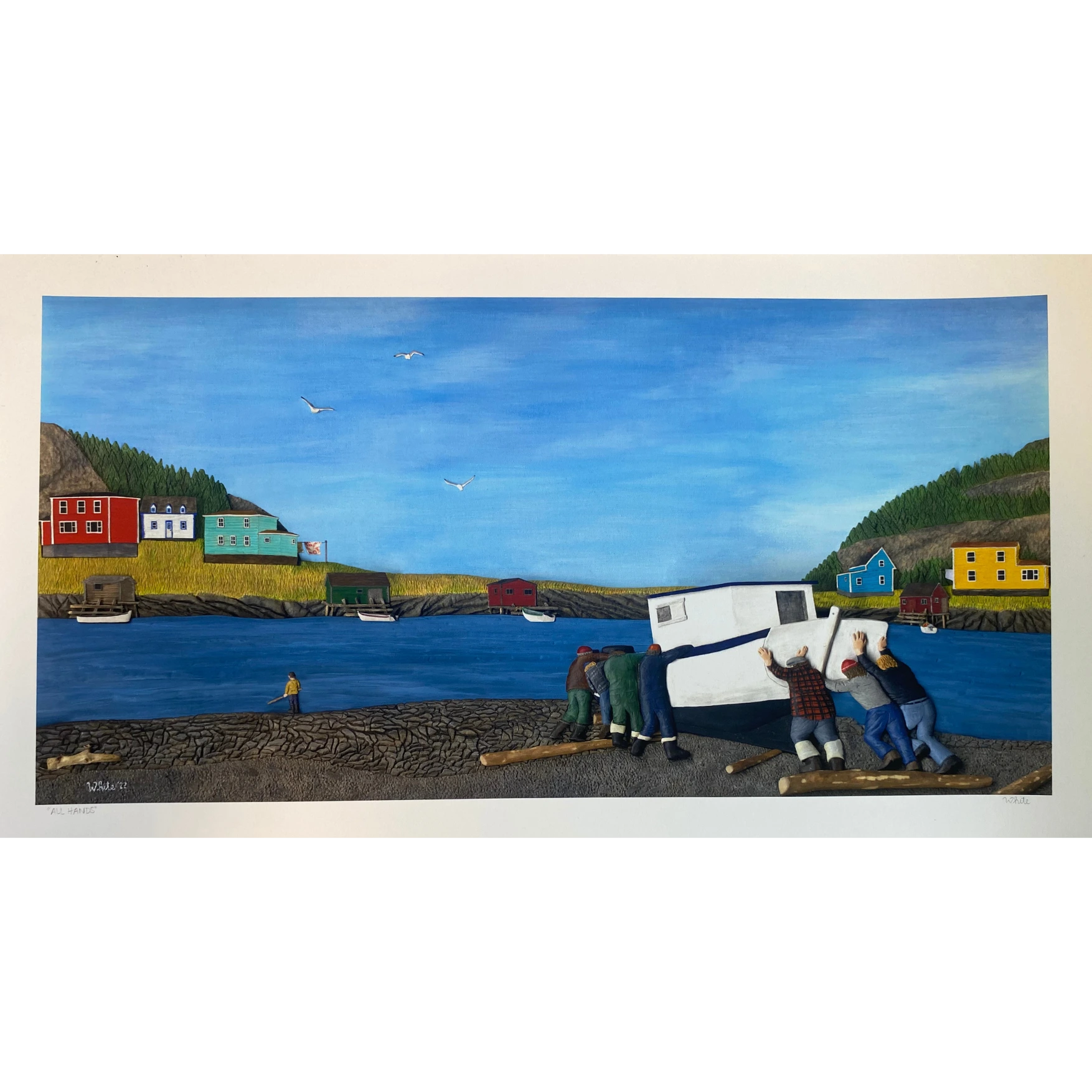 The print depicts a group of fishermen working together to haul a boat into the water. There is a child playing on the shore nearby. In the background, colourful Newfoundland houses dot the coastal landscape, creating a picturesque scene.