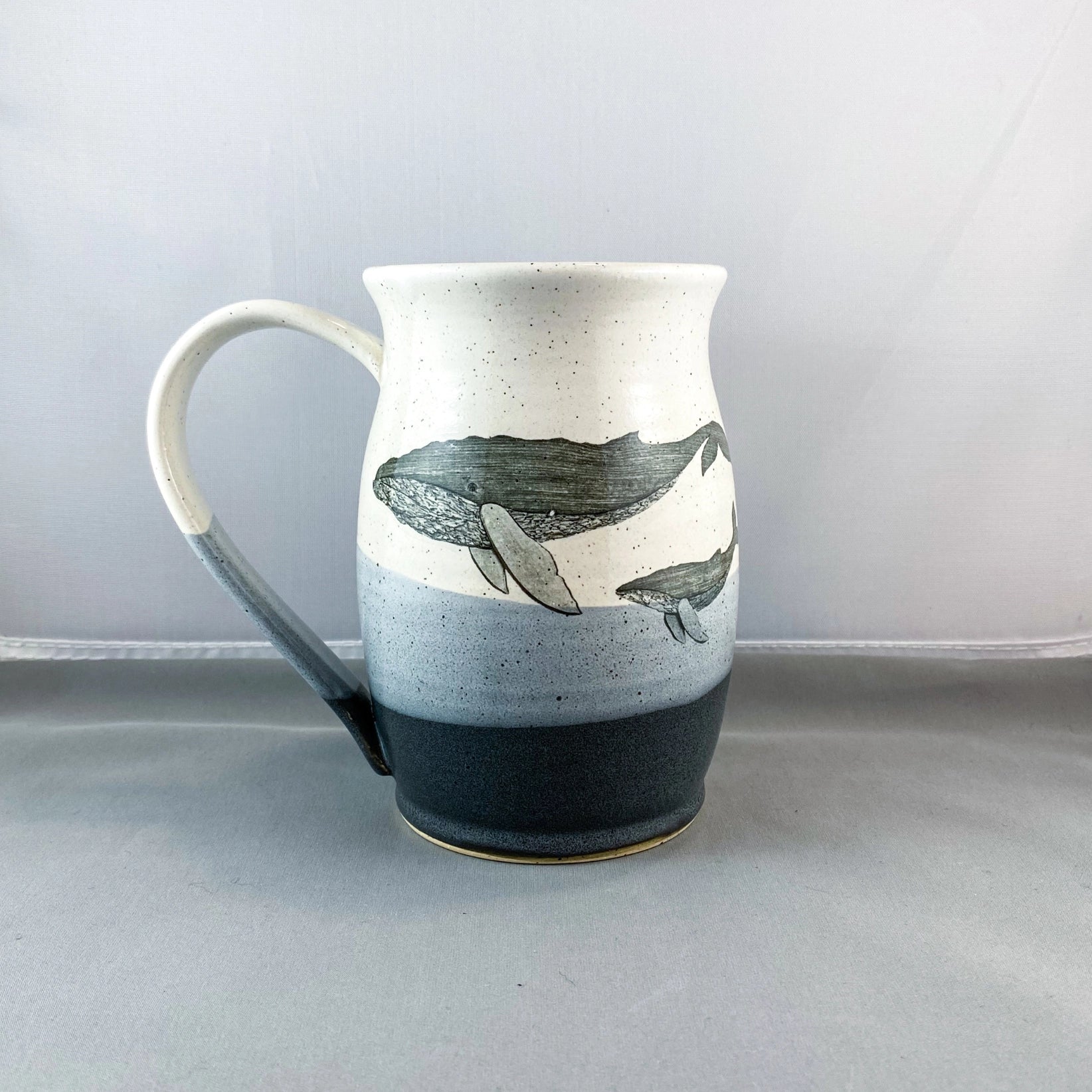 Locally made by CUP Studios, 500mL mug with the decal of a mother whale and calf. Decal made from an image of original driftwood artwork.