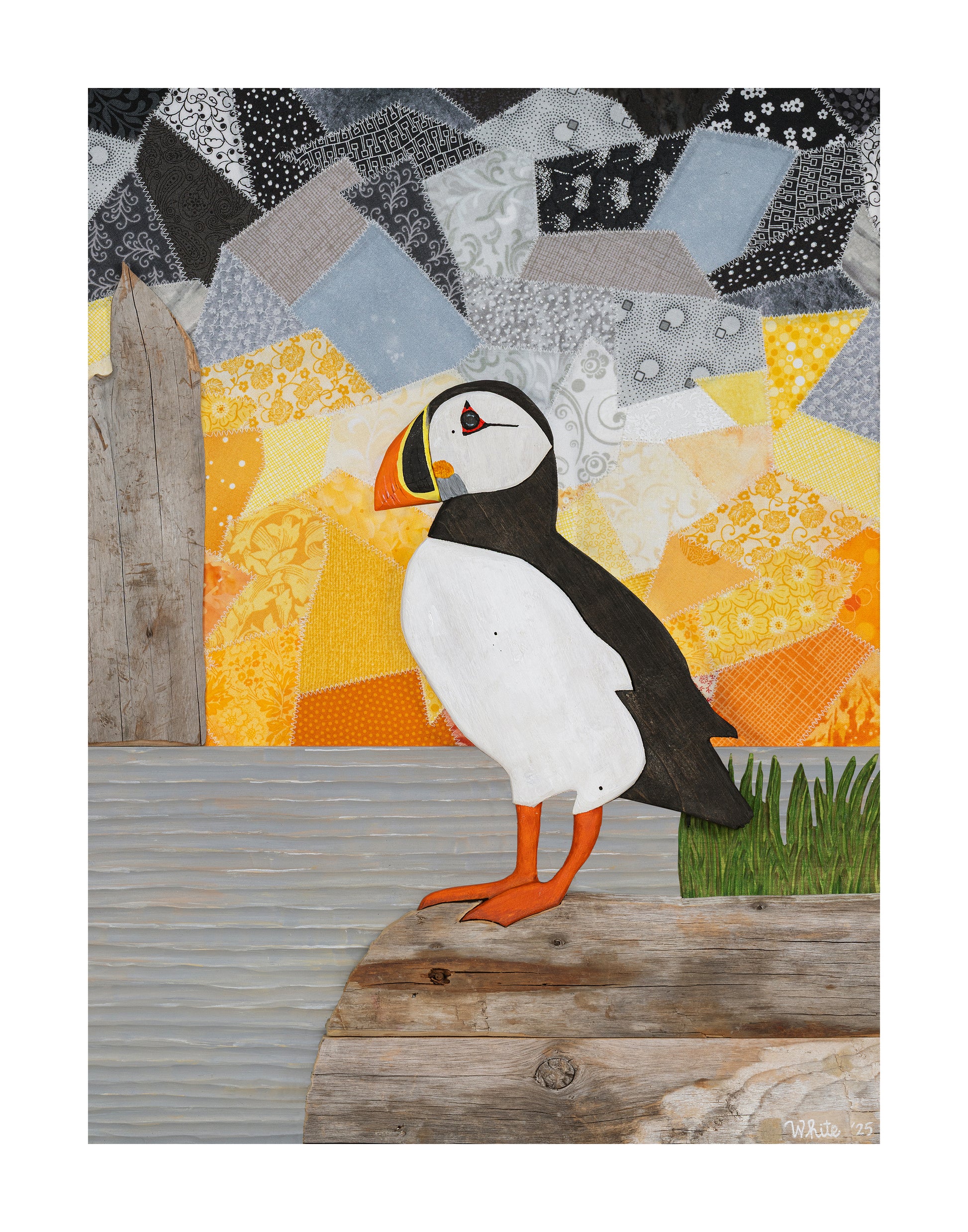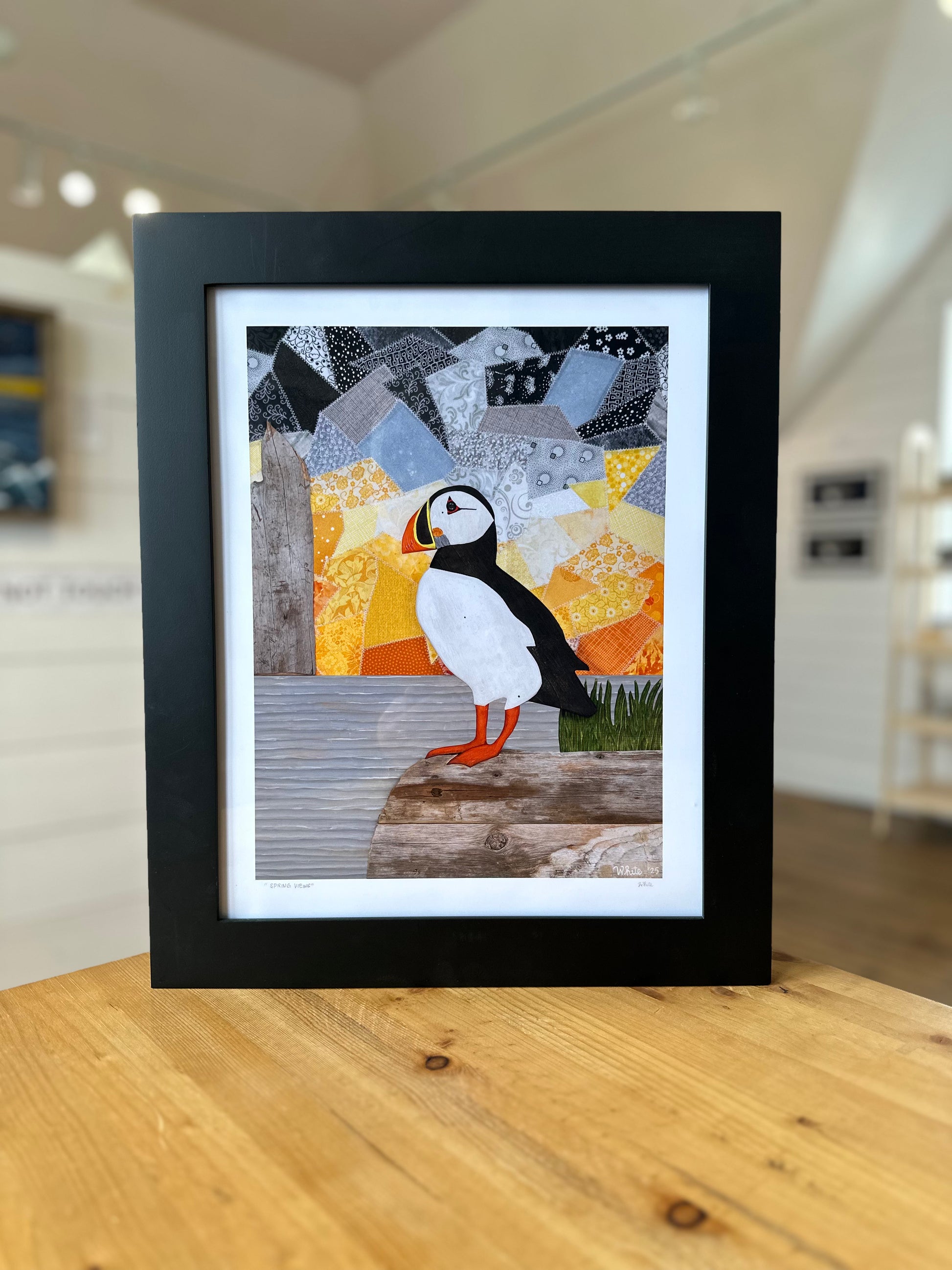 "Spring Views" reproduction print showcases a puffin perched on a coastal rock, gazing at a picturesque sunset over the ocean. Created from a 2025 mixed media original, this print has an outside dimension of 11"x14" with an image size of 9"x12" and a 1" white border.