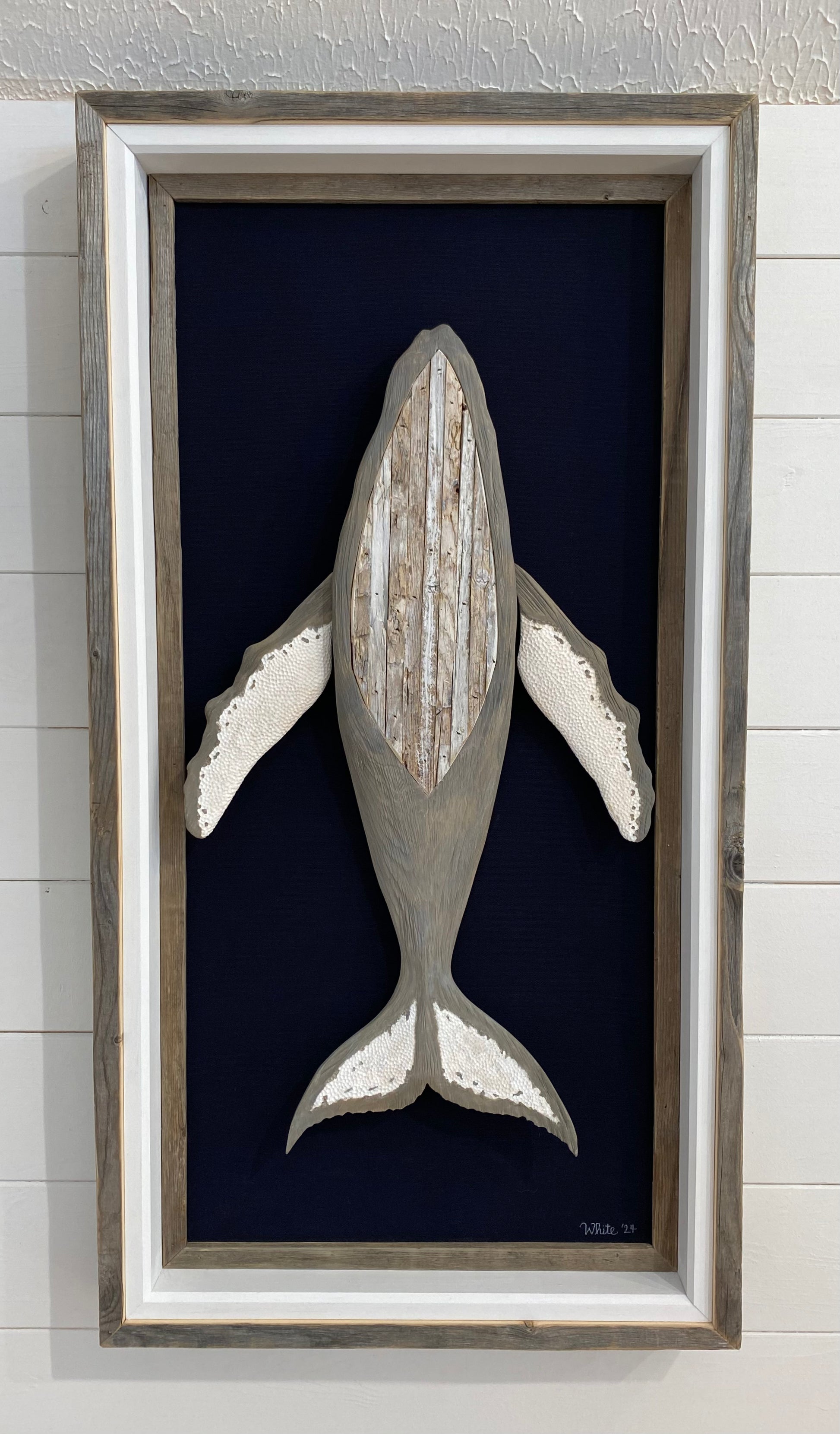 "The Ascent" by The White's Emporium is a mixed media artwork made from various woods and fabric depicting a humpback whale ascending to the surface. The exterior frame is made of driftwood/reclaimed wood with a white pine inside trim. The background is made of navy cotton canvas. The single humpback whale is made from reclaimed wood and driftwood.
