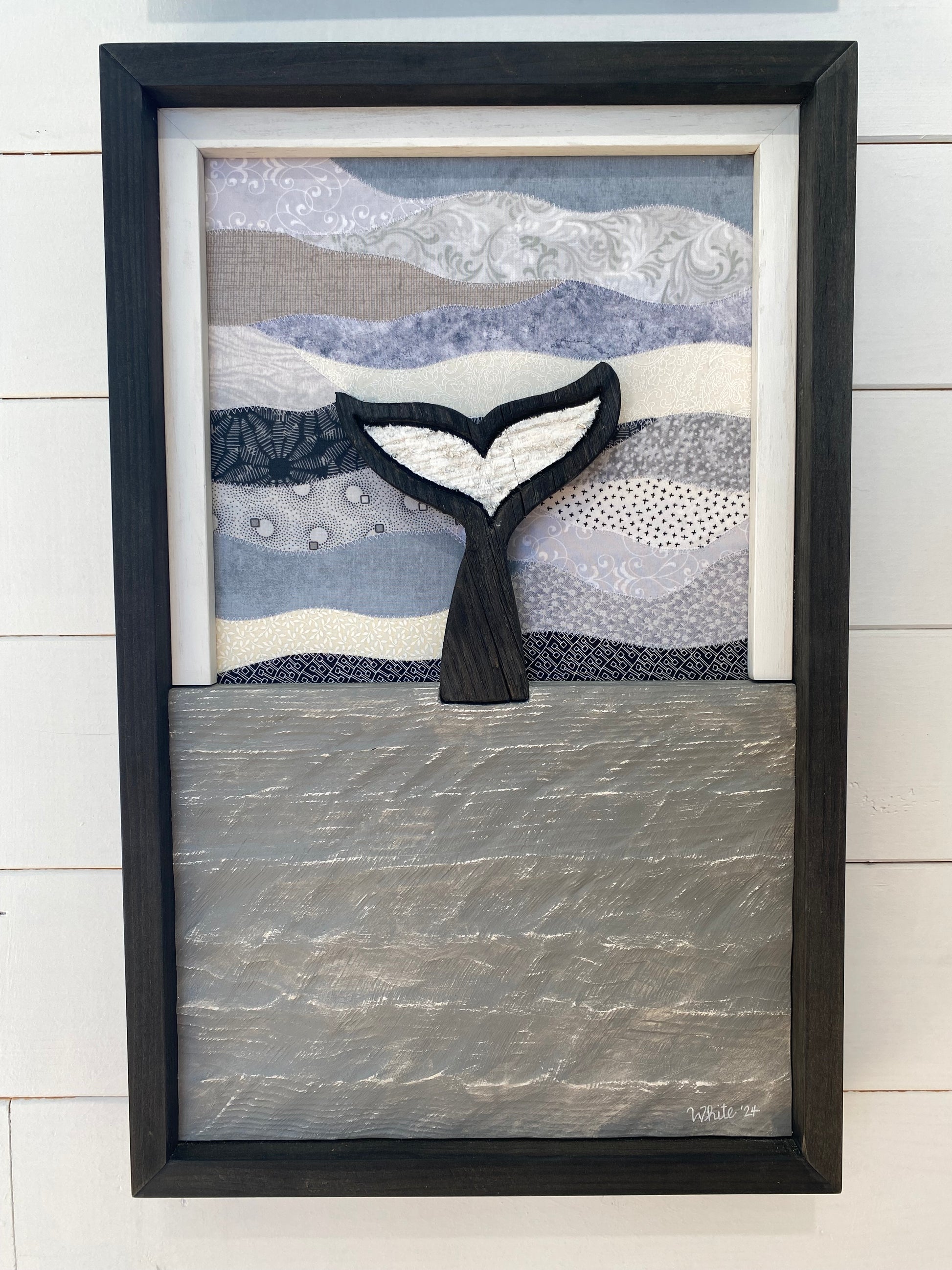 "The Descent - Water Street Series" is mixed media artwork of a whale tail diving into the water with a quilted fabric sky background.