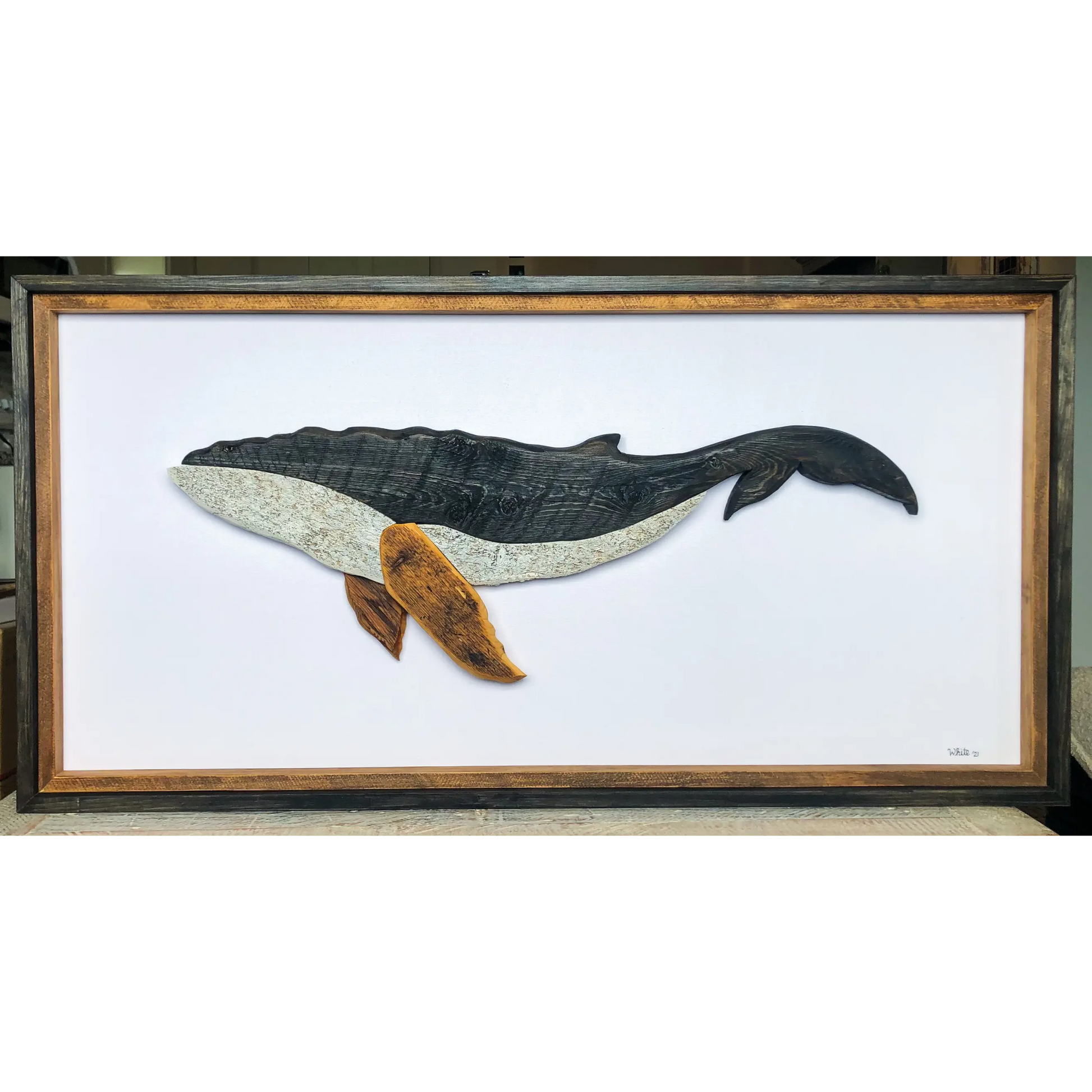 A black and brown whale with a black exterior frame, natural brown tone wood interior trim and fins, and a white canvas backing.