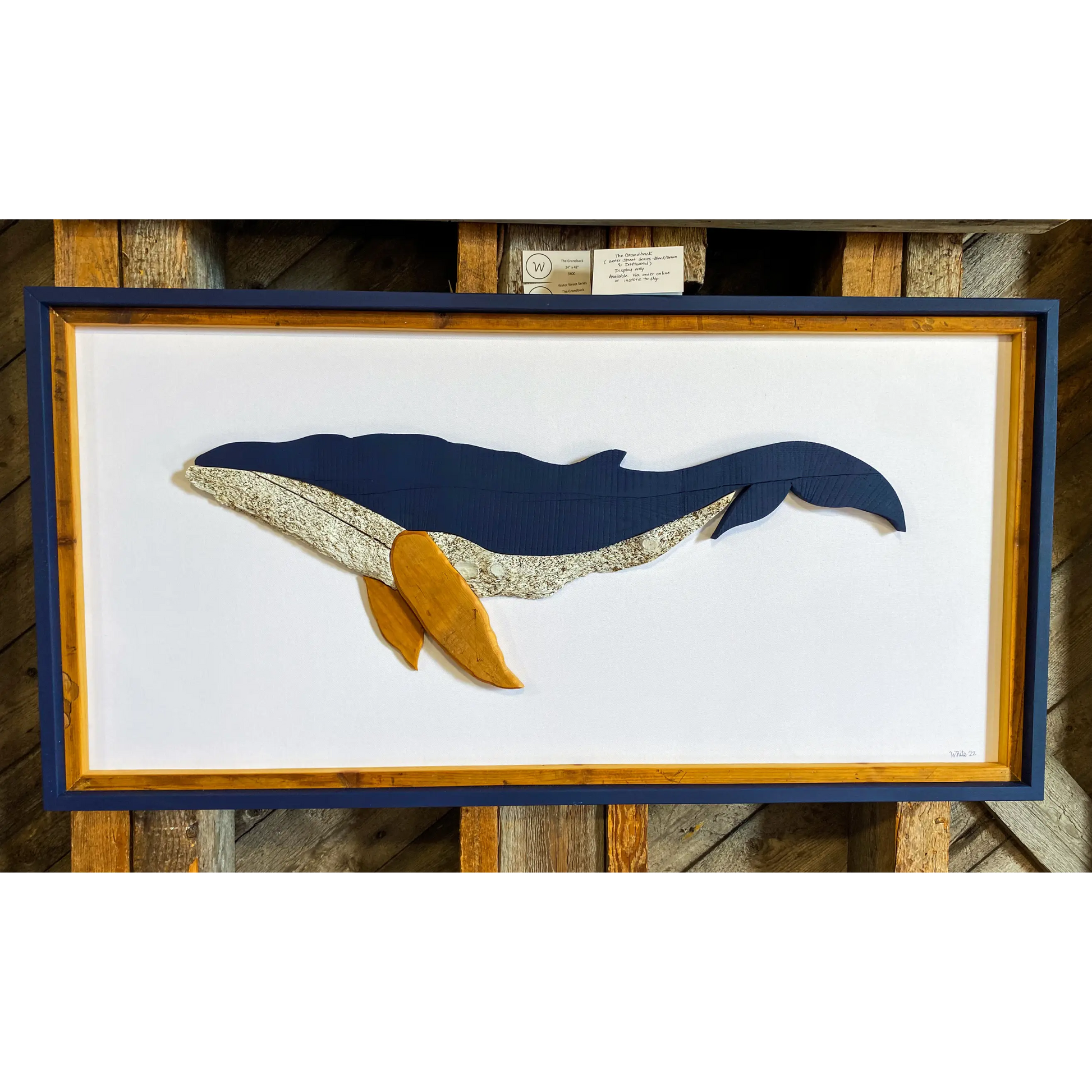 The Grandback, a mixed media artwork by The White's Emporium from the Water Street Series, showcases a Grandback whale made from reclaimed wood and driftwood. This piece has a few variations: