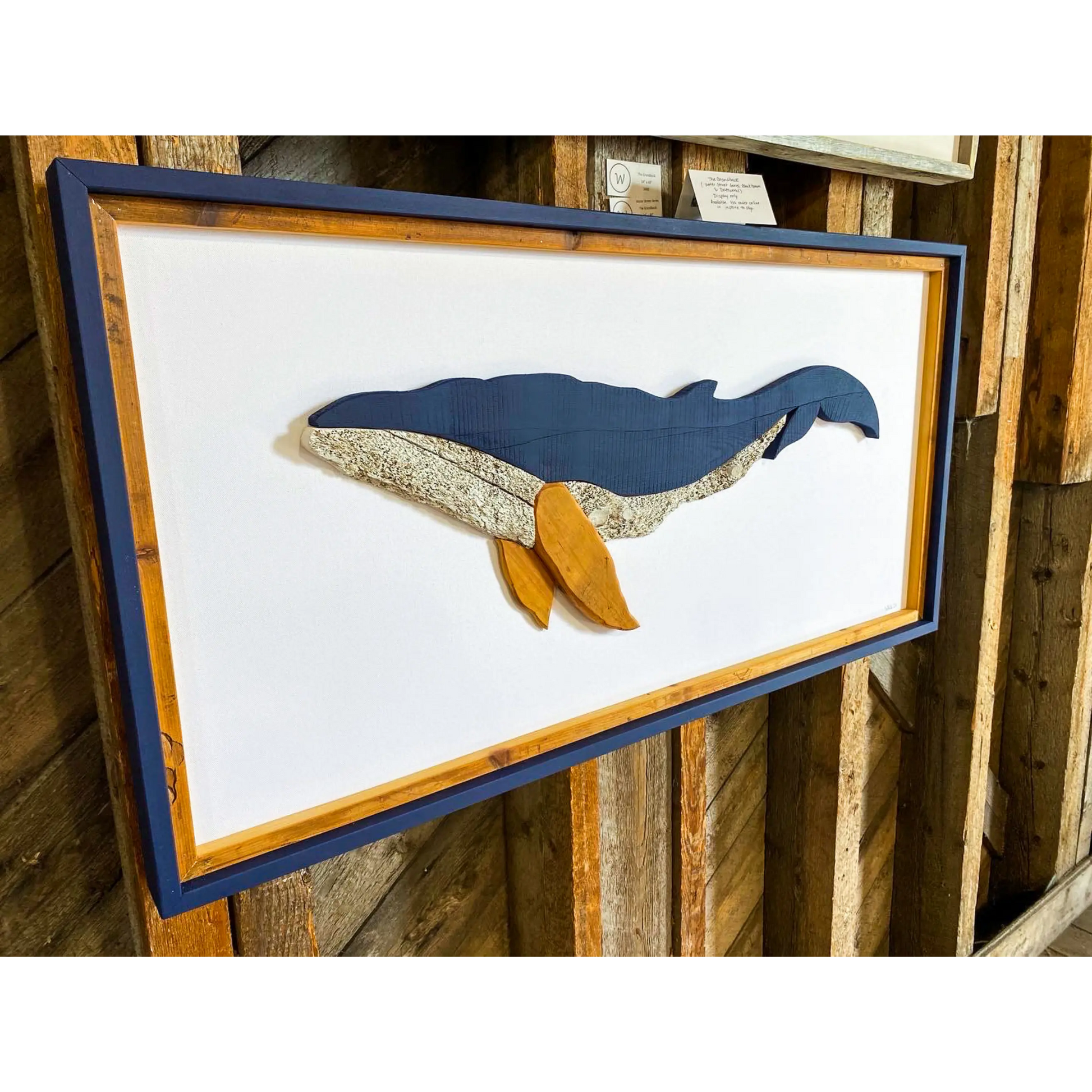 A navy whale with a navy exterior frame, natural brown tone wood interior trim and fins, and a white canvas backing.