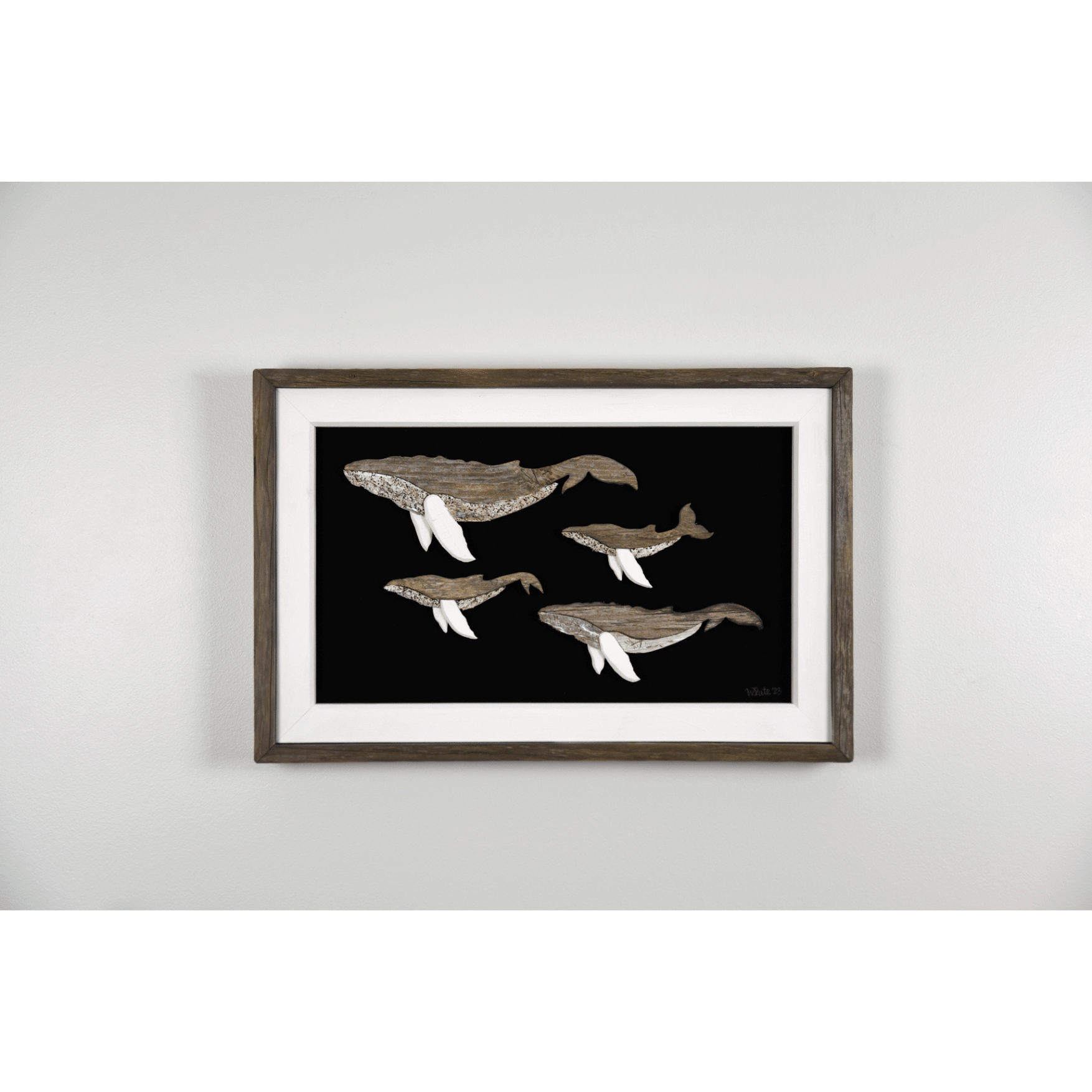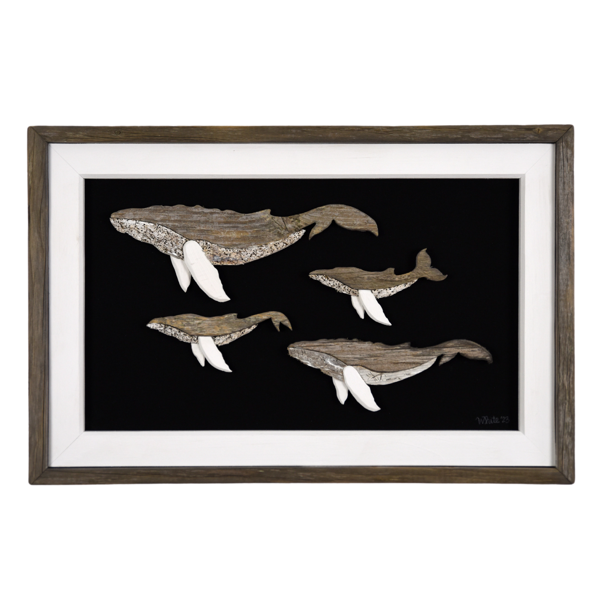Add a touch of coastal charm to your home with "The Mother - Family Edition" art piece by White's Emporium. The beautiful driftwood and reclaimed wood frame, white pine inside trim, and navy or black canvas backing create a perfect backdrop for the four humpback whales made from reclaimed wood and driftwood. The larger whales represents the mother and father whale, while the smaller two represent her calves. The available dimensions are 14"x22", 24"x36", and 24"x48".